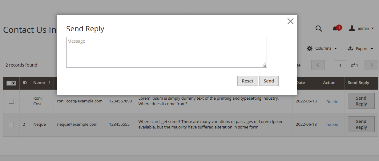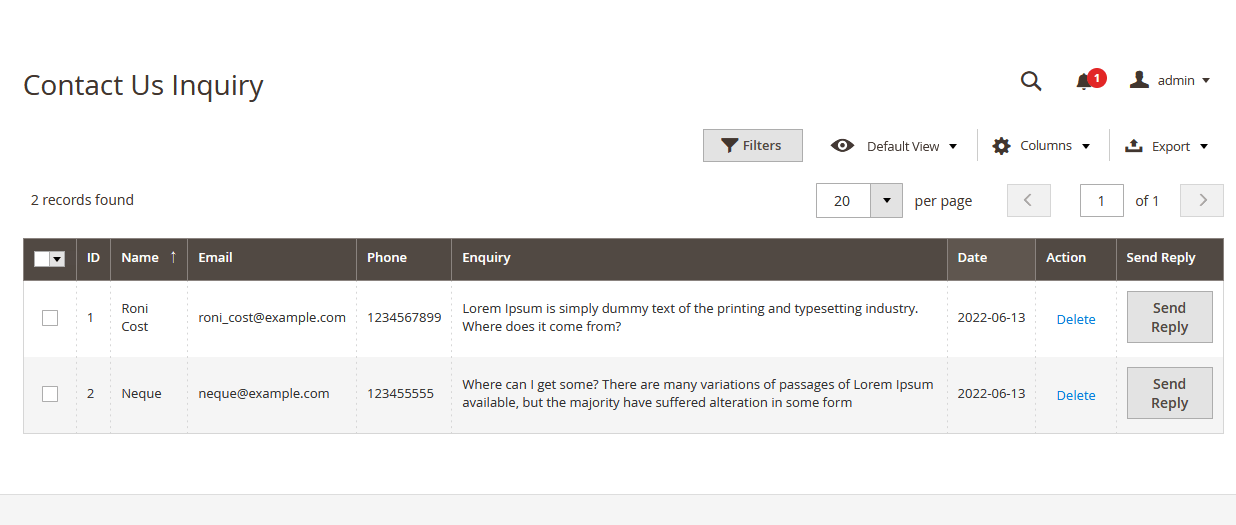 With the help of this extension, Admin can view all the Contact Us form data in the admin panel in a grid view. Admin can also delete the records from grid manager, admin can also export all the records in CSV or Excel XML format. Admin can also filter the records from the filter section. With the help of this extension, admin can "Send Reply" from the grid manager via "Send Reply" button features. Admin can easily search, delete, select and view records and also export them to CSV or XML from the back-end. All form submissions data are saved and accessible from Magento 2 administration panel.