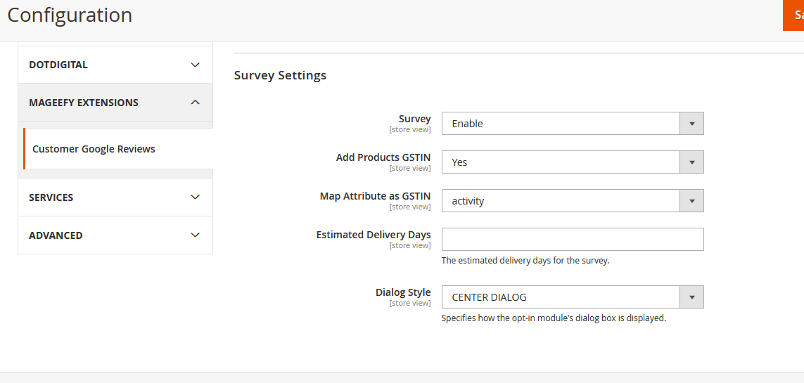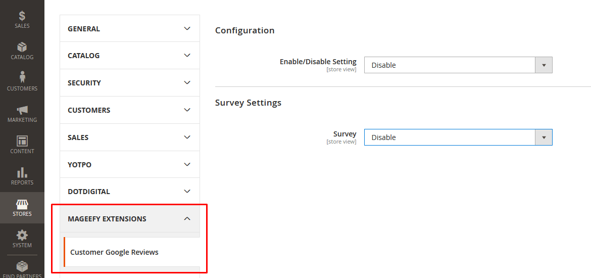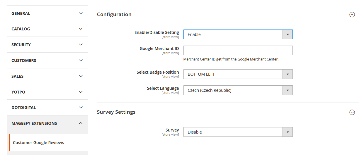 Login into the admin panel then Go To Stores >> Configuration >> Mageefy Extensions >> Customer Google Reviews and here you can see all the settings.