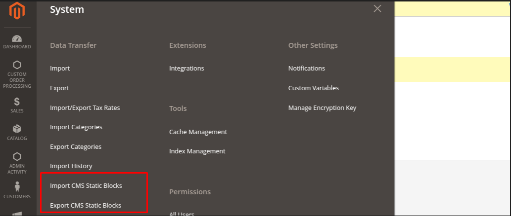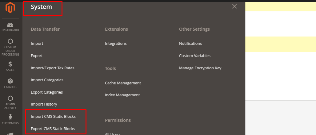 Login into the admin panel then Go To SYSTEM >> Data Transfer >> Import CMS Static Blocks & Export CMS Static Blocks and here you can see all the settings or configuration of the module.