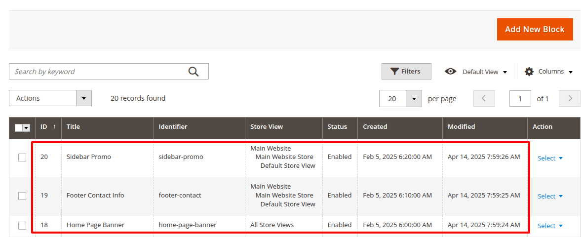 - Supports all key CMS block attributes: title, identifier, content, store view, and enabled status