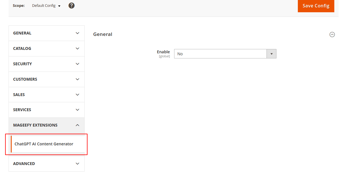 Login into the admin panel then Go To STORES >> Configuration >> Mageefy Extensions >> ChatGPT AI Content Generator and here you can see all the settings or configuration of the module.