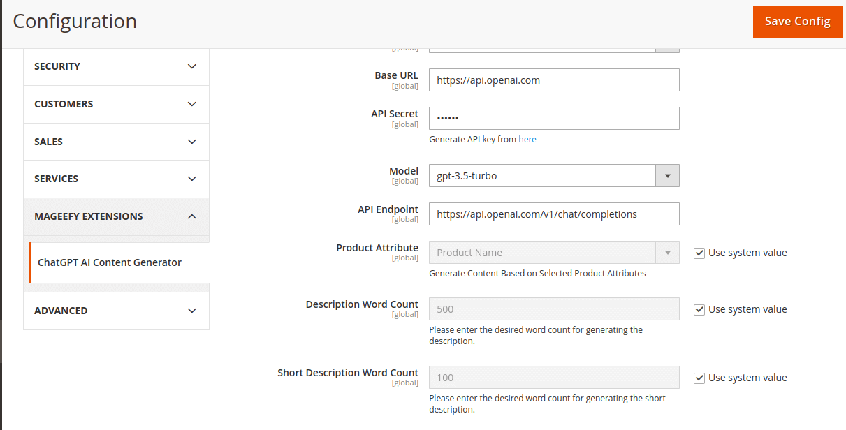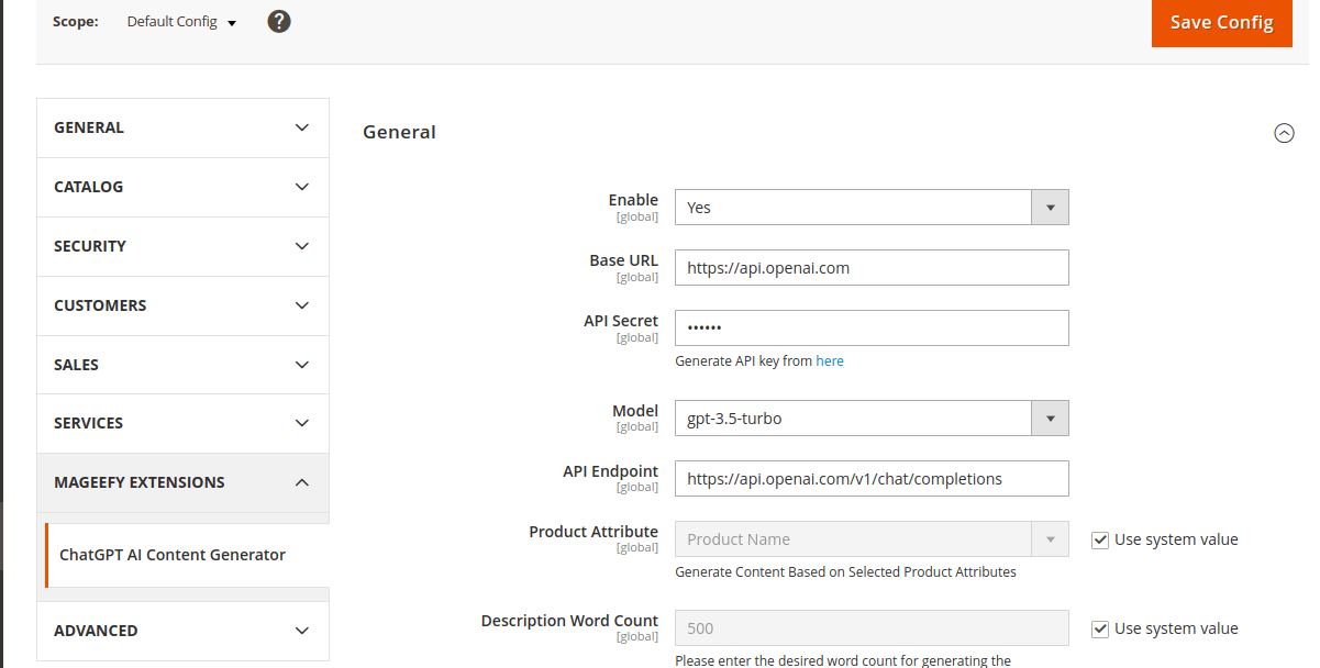 Note: The extension uses OpenAI APIs to auto-generate content in Magento 2. You must create an OpenAI account and get the API secret key to use the extension. Pricing is applicable as per the usage.