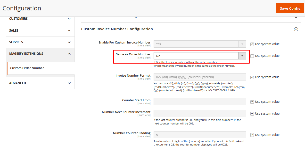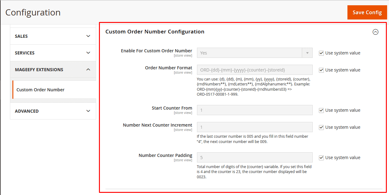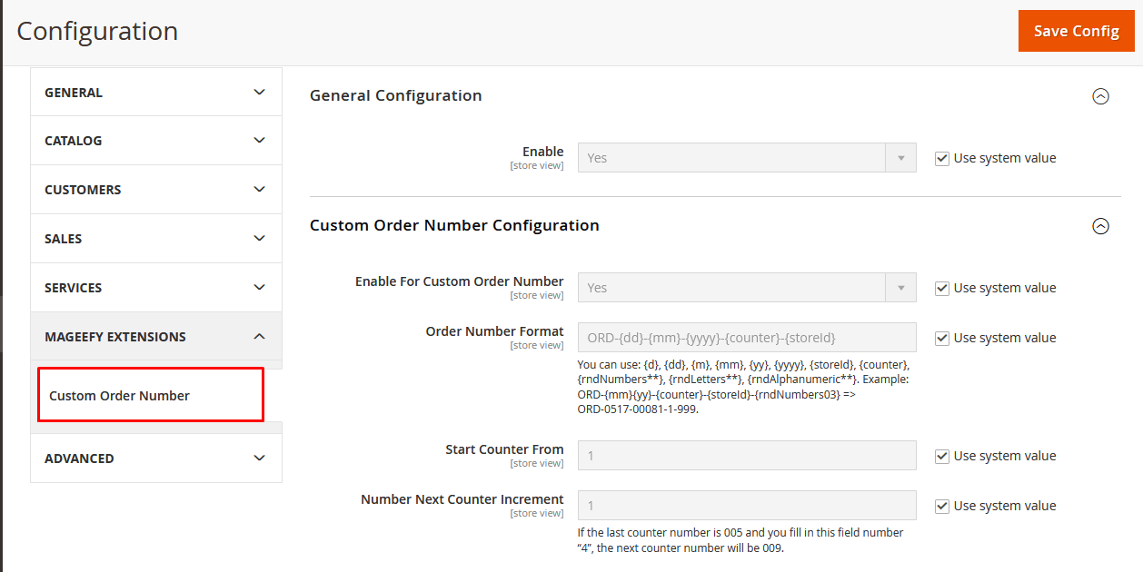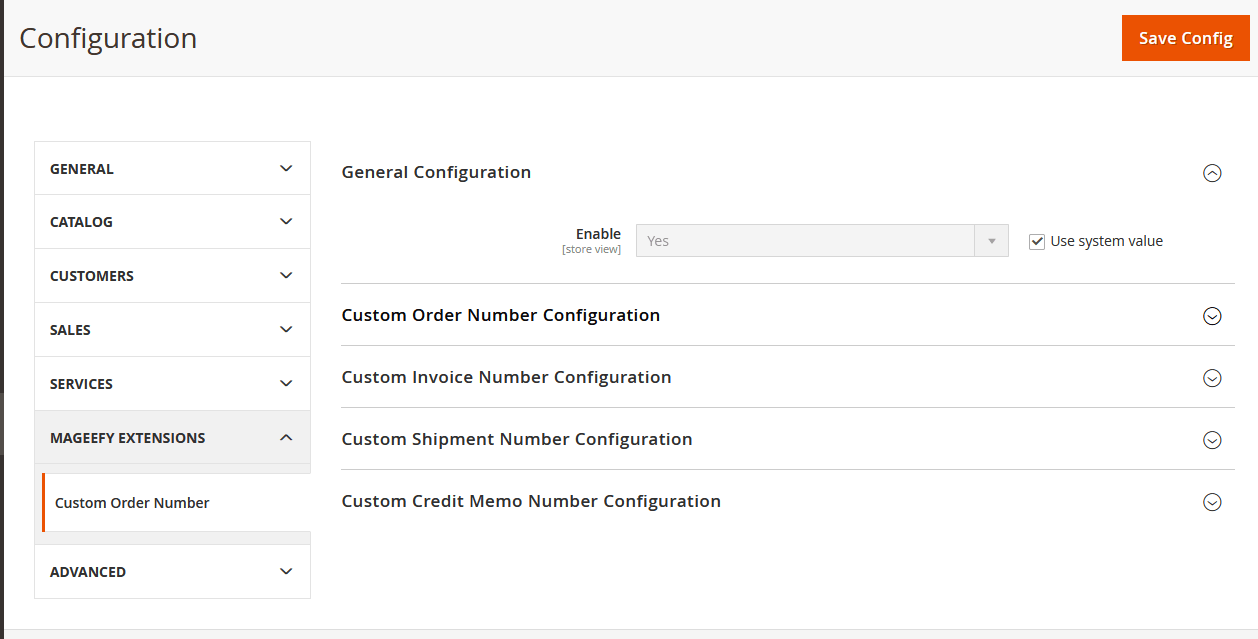Login into the admin panel then Go To STORES >> Configuration >> Mageefy Extensions >> Custom Order Number and here you can see all the settings or configuration of the module.