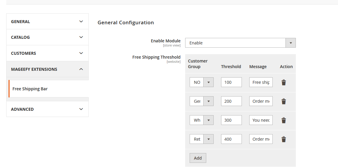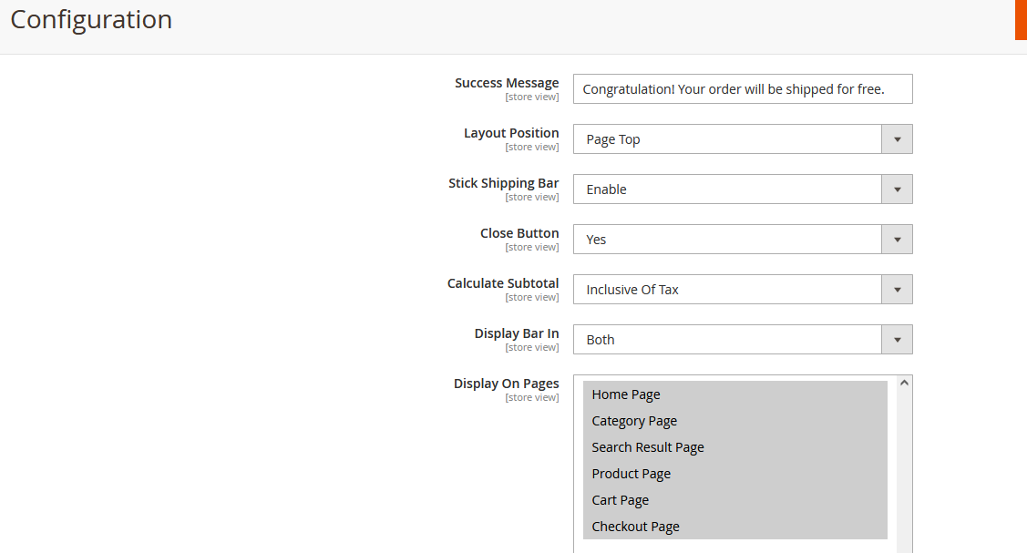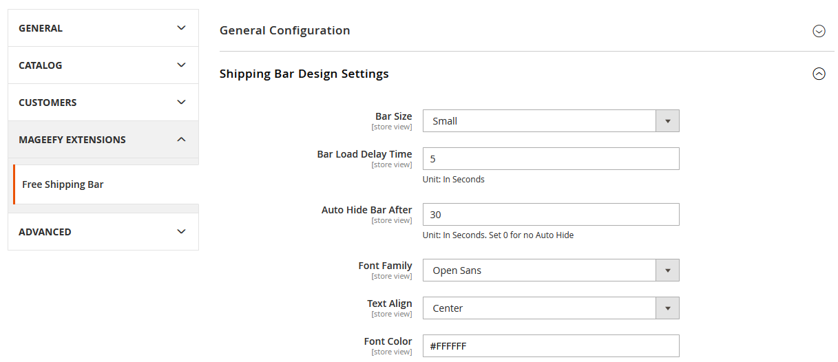 Login into the admin panel then Go To Stores >> Configuration >> Mageefy Extensions >> Free Shipping Bar and here you can see all the configuration and settings of the module.