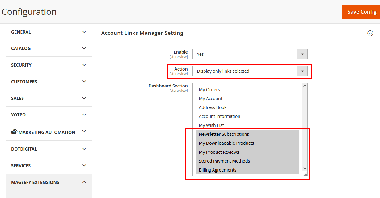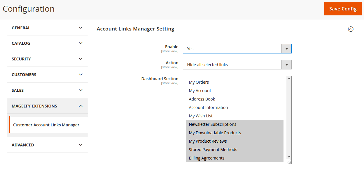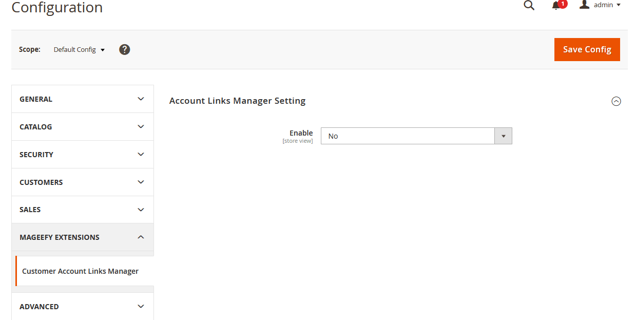 Login into the admin panel then Go To Stores >> Configuration >> Mageefy Extensions >> Customer Account Links Manager and here you can see all the configuration and settings of the module.