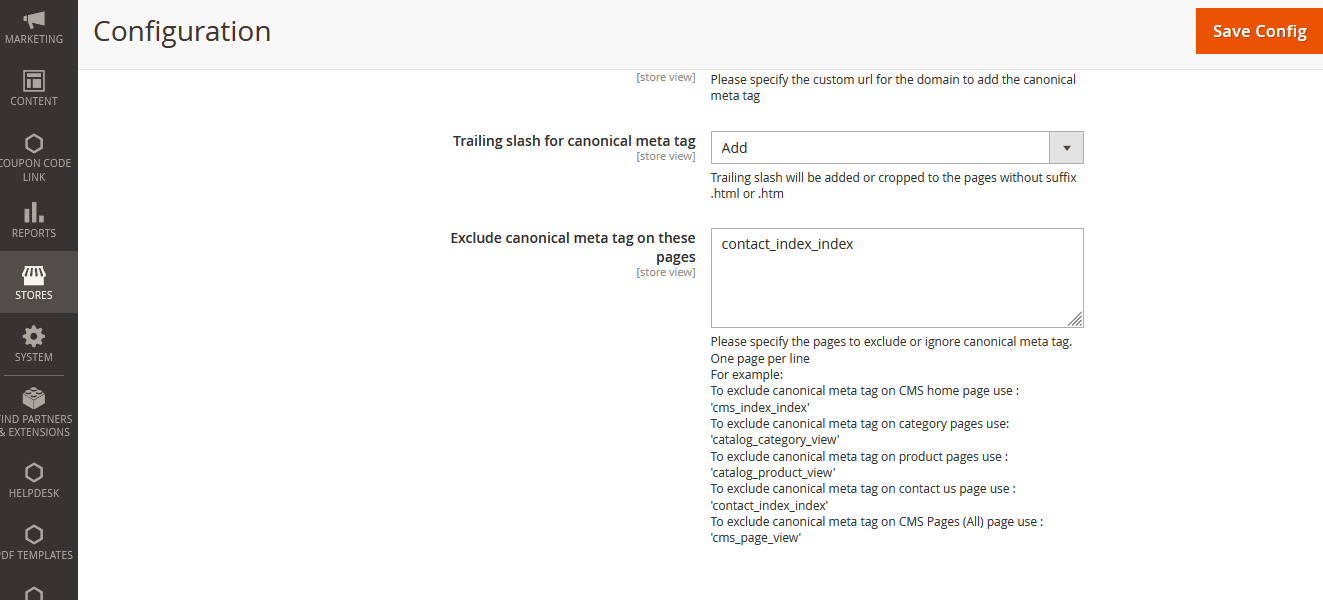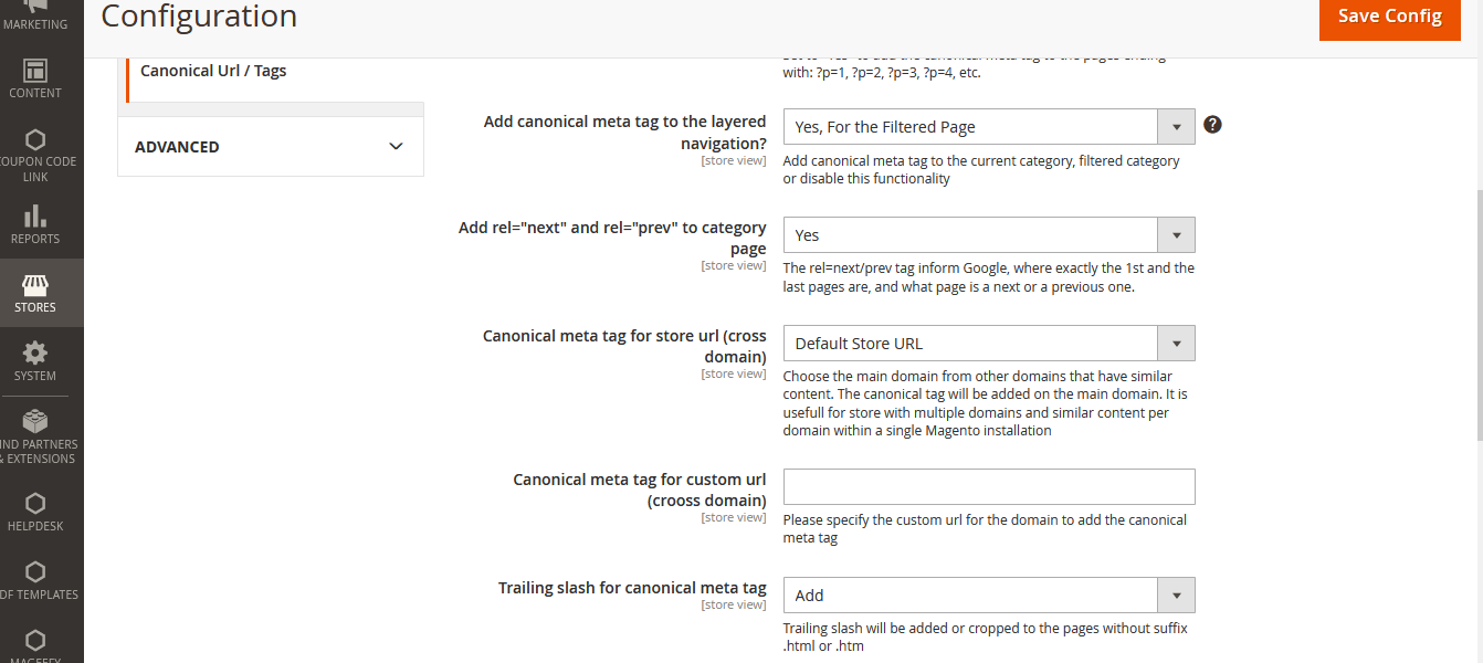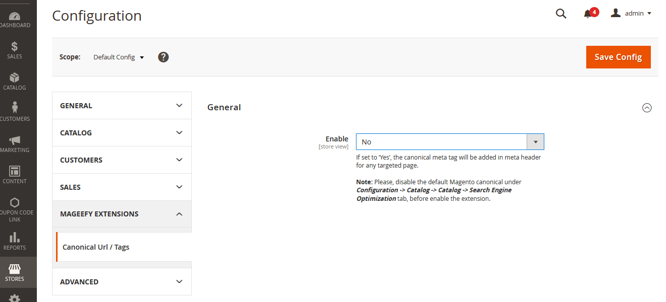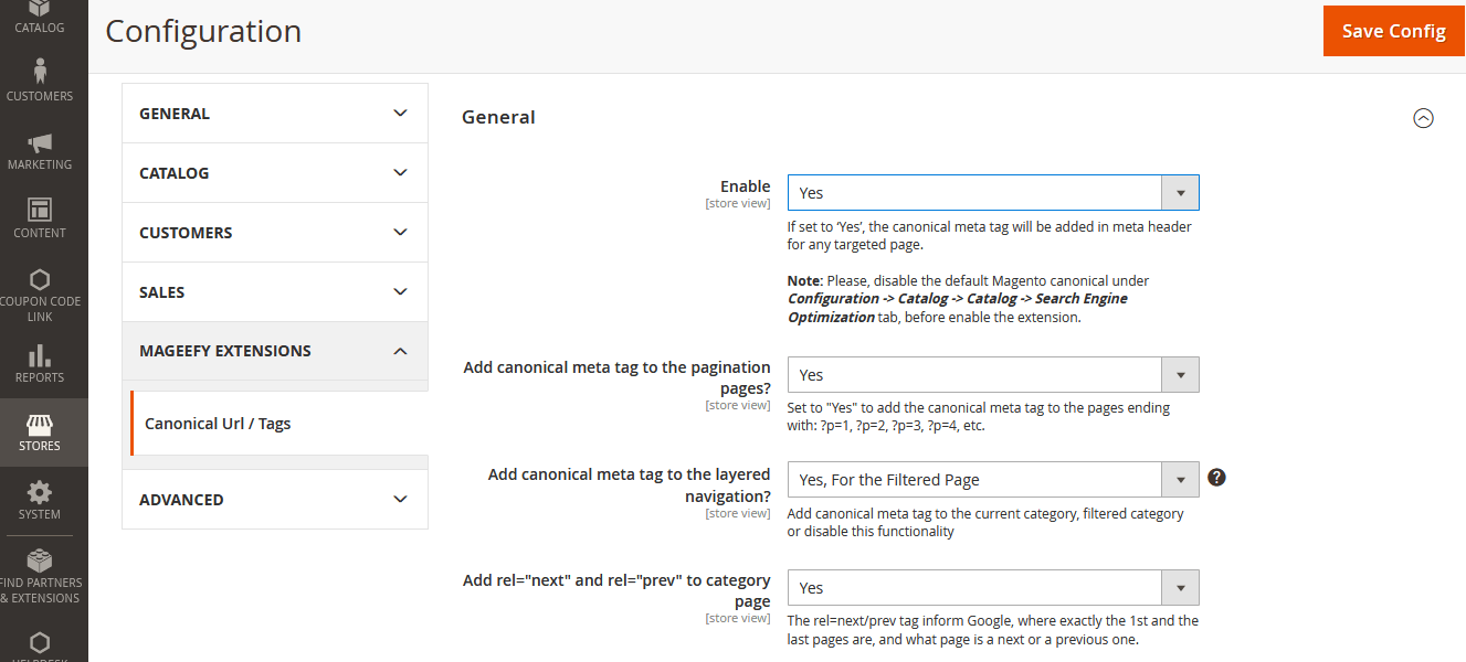 Login into the admin panel then Go To STORES >> Configuration >> Mageefy Extensions >> Canonical Url / Tags and here you can see all the settings or configuration of the module.