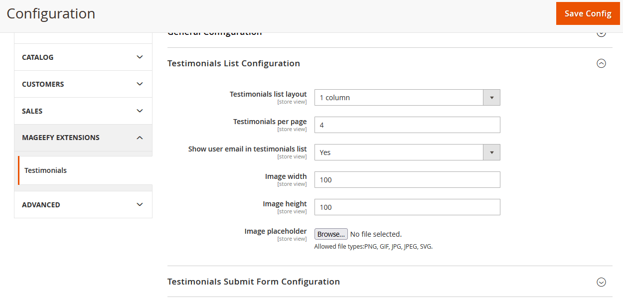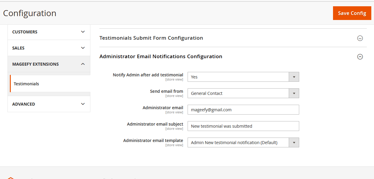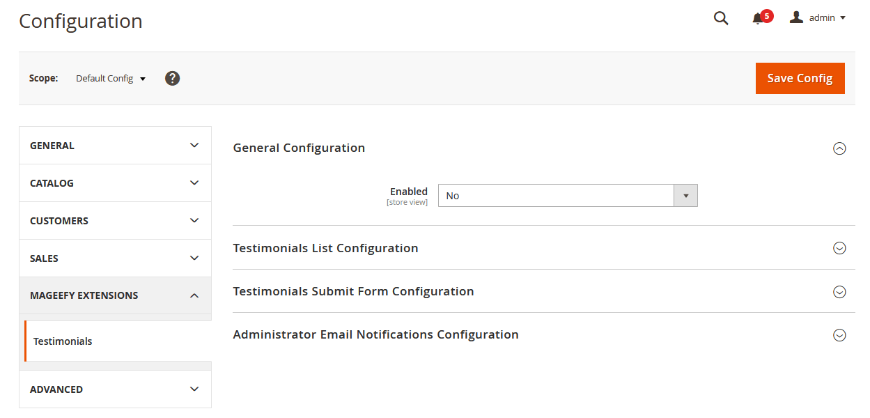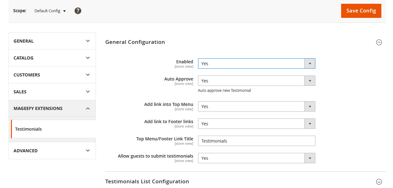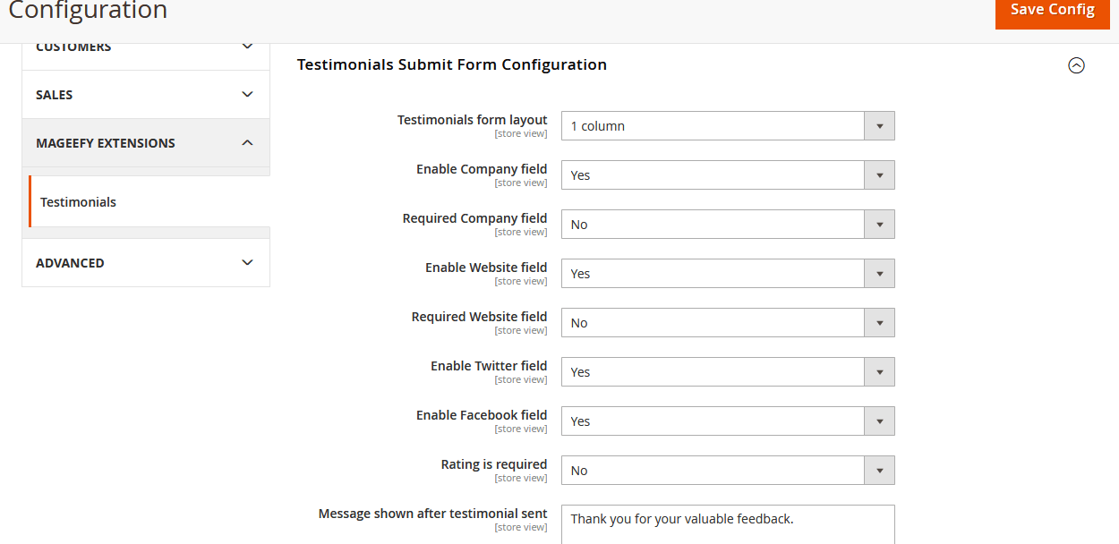 Login into the admin panel then Go To STORES >> Configuration >> Mageefy Extensions >> Testimonials and here you can see all the settings or configuration of the module.