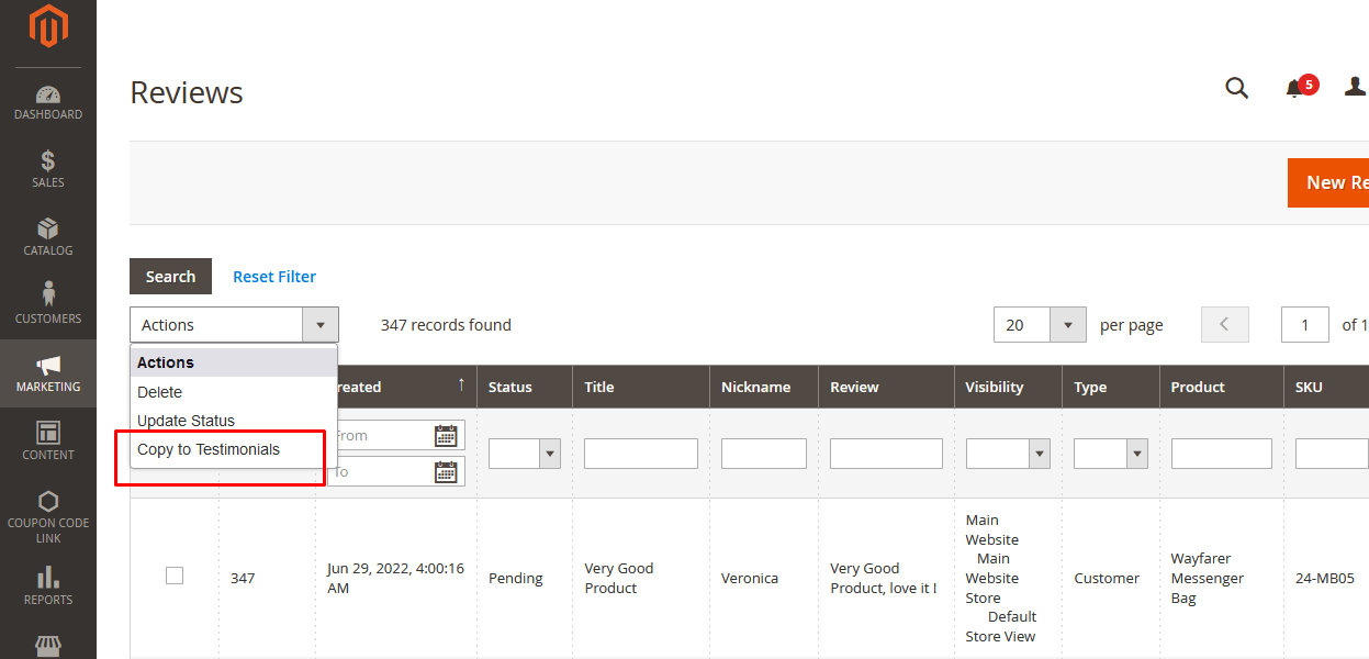 With the help of Magento 2 Testimonials Manager Extension, admin can convert or copy product reviews to the testimonials list. From the backend Reviews Manager list, you can choose the items you want to copy, and click on the "Copy to Testimonials" action to copy product reviews data to the testimonials list.