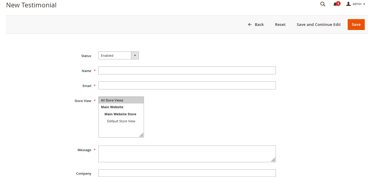 The module also includes a set of widgets such as show full testimonials list and show List of testimonials (Sidebar Main). The "Full Testimonials List" widget will show a list with all testimonials on custom CMS pages and the "List of Testimonials (Sidebar Main)" widget will show a rotating testimonials list in a sidebar. Admin can display Toplink in header and footer link for Customer Testimonial in frontend and can also change its title. The module comes with great email settings in the backend. Once the customer add new testimonials, store owner will get an email notification. In the extension backend configuration, you can enable the administrator notification email upon new testimonial submission, choose the contact to send email from, specify the admin email address, specify a subject of email notification, and also choose an email notification template.