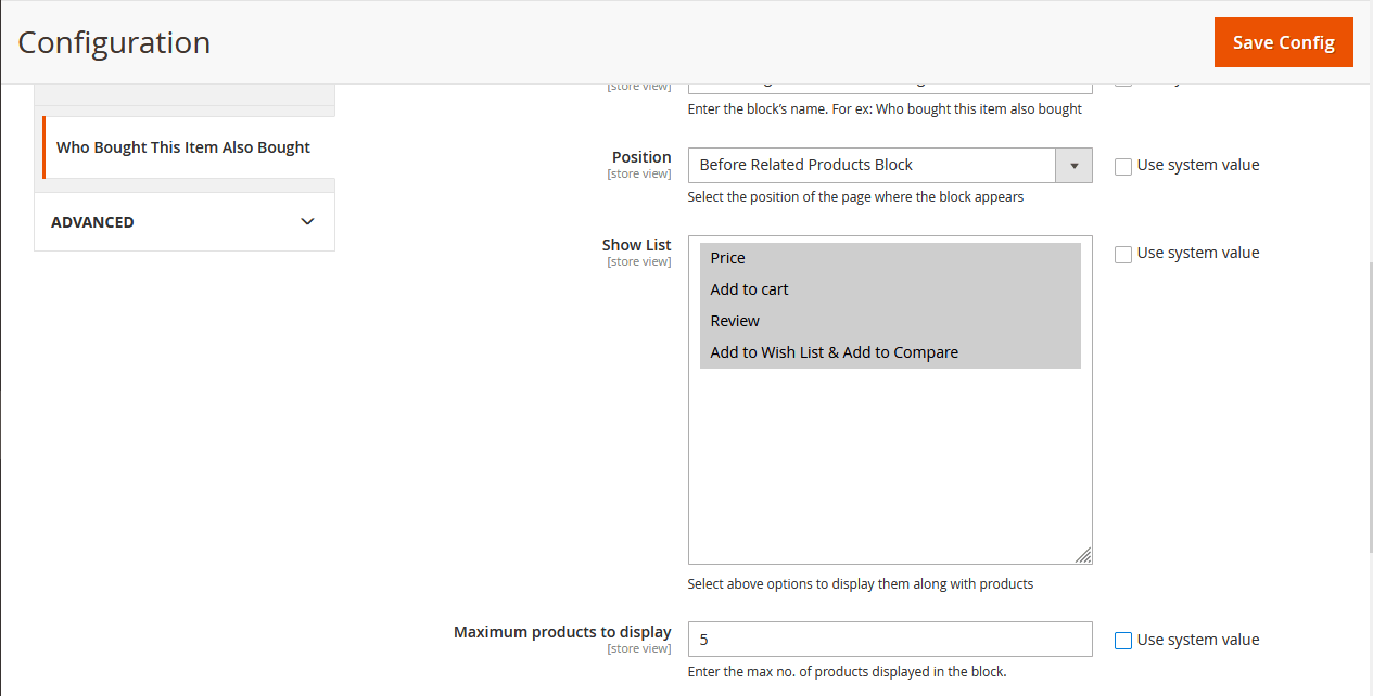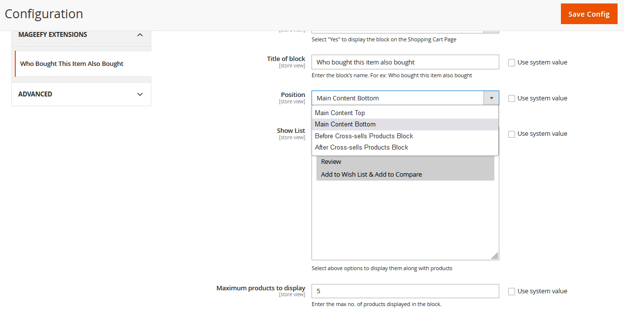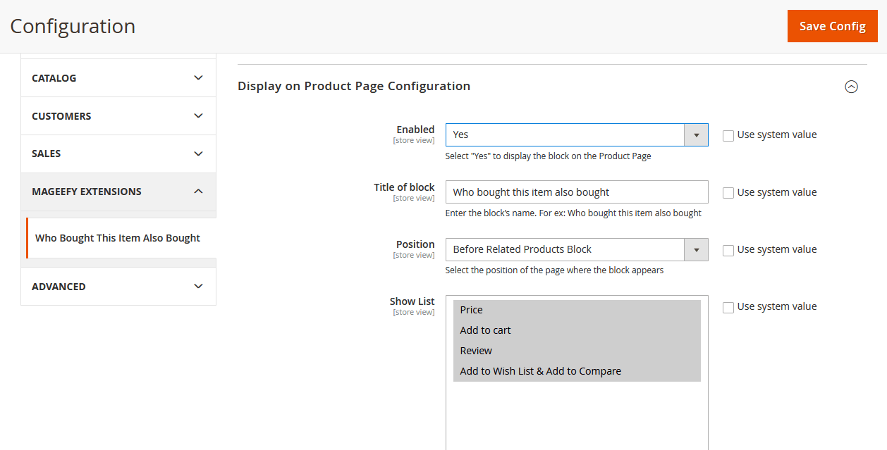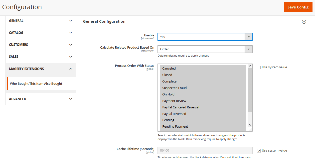 Login into the admin panel then Go To STORES >> Configuration >> Mageefy Extensions >> Who Bought This Item Also Bought and here you can see all the settings or configuration of the module.