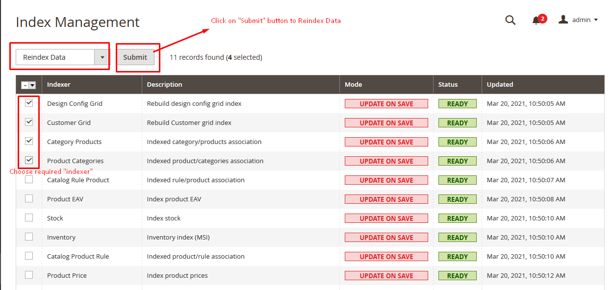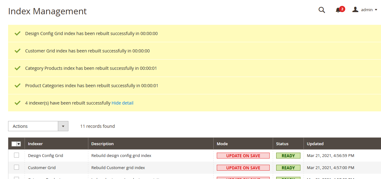 Instead of running the complicated command line, store admin can reindex data right from the backend. Only by selecting one or mass indexers, select "Reindex Data" and click on Submit, the data will be reindexed immediately. In Index Management at the backend, after choosing the indexers, Reindex Data is now available in the Actions box for the admin to choose. Just a click on Submit and all your data is now ready, clean, and bright. After reindexing is finished, a message will be displayed to confirm again about the process.