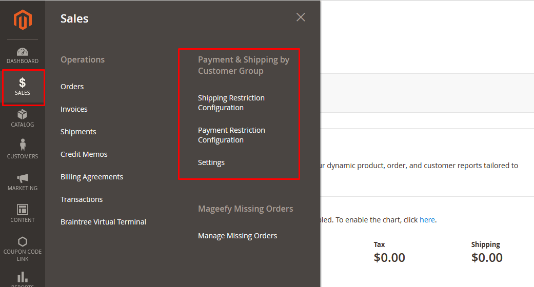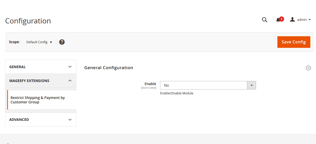 Login into the admin panel then Go To STORES >> Mageefy Extensions >> Restrict Shipping & Payment by Customer Group and here you can see all the settings or configuration of the module.