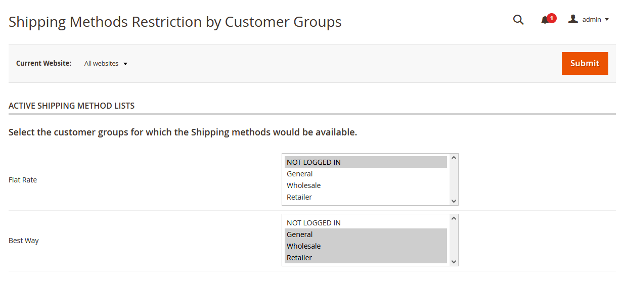 - The admin can decide and assign the different shipping methods to a particular customer group accordingly.