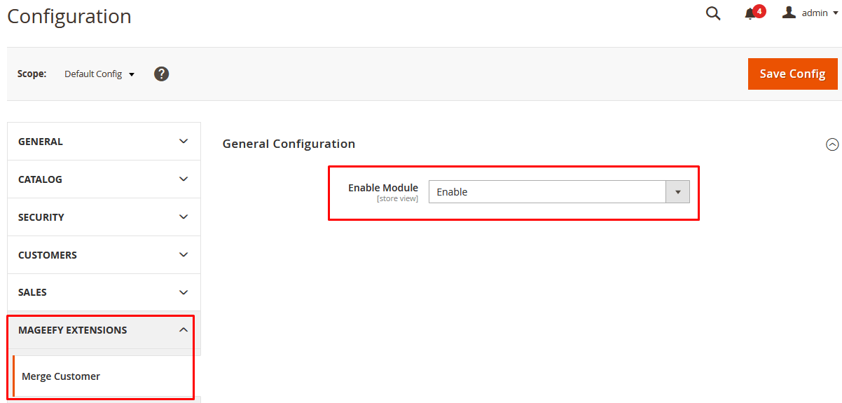 Login into the admin panel then Go To STORES >> Configuration >> Mageefy Extensions >> Merge Customer and here you can see all the settings or configuration of the module.