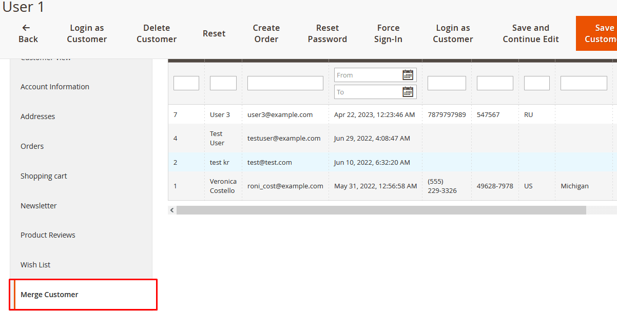 With the help of this Merge Customer Accounts Extension for Magento 2, the store owner can easily merge customer accounts together to keep all customer information in one place. It automatically transfers customer and order-related data to the main account and deletes merging customer automatically once the merge is complete.