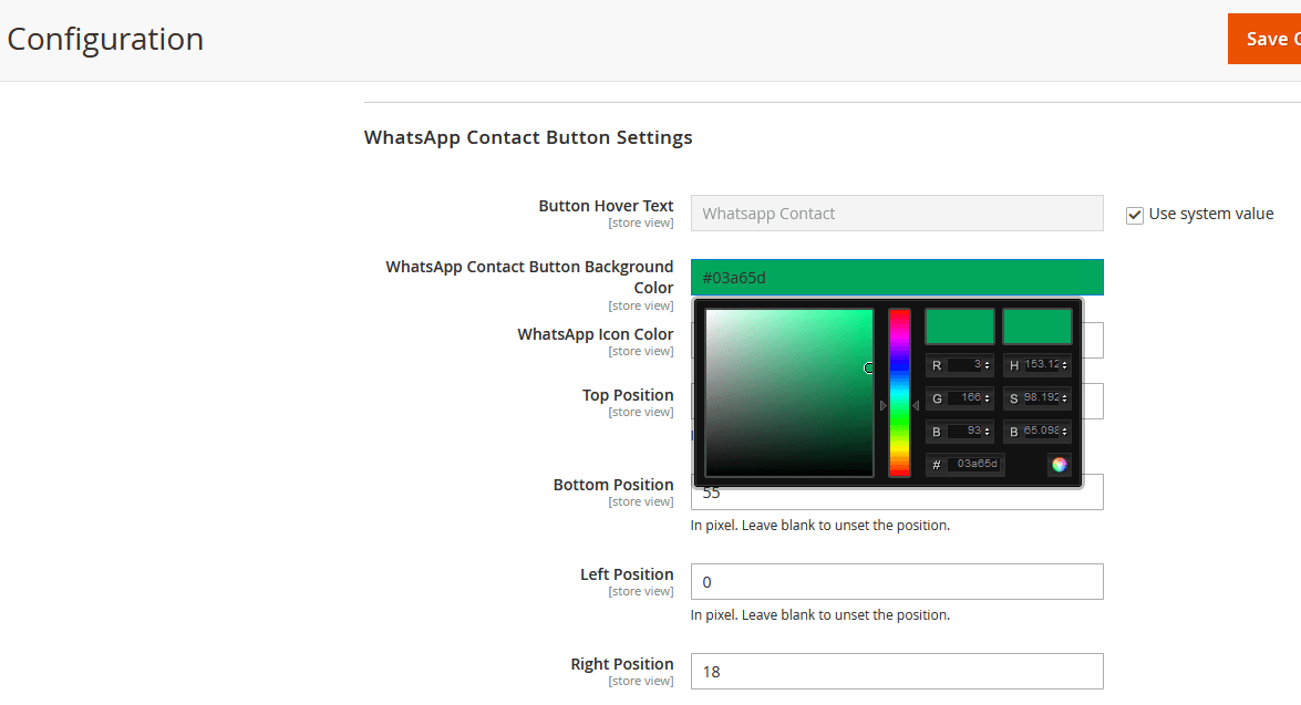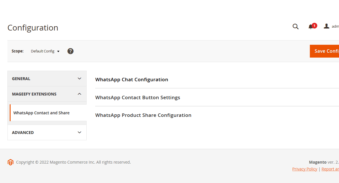 Login into the admin panel then Go To Stores >> Configuration >> Mageefy Extensions >> WhatsApp Contact and Share and here you can see all the configuration and settings of the module.